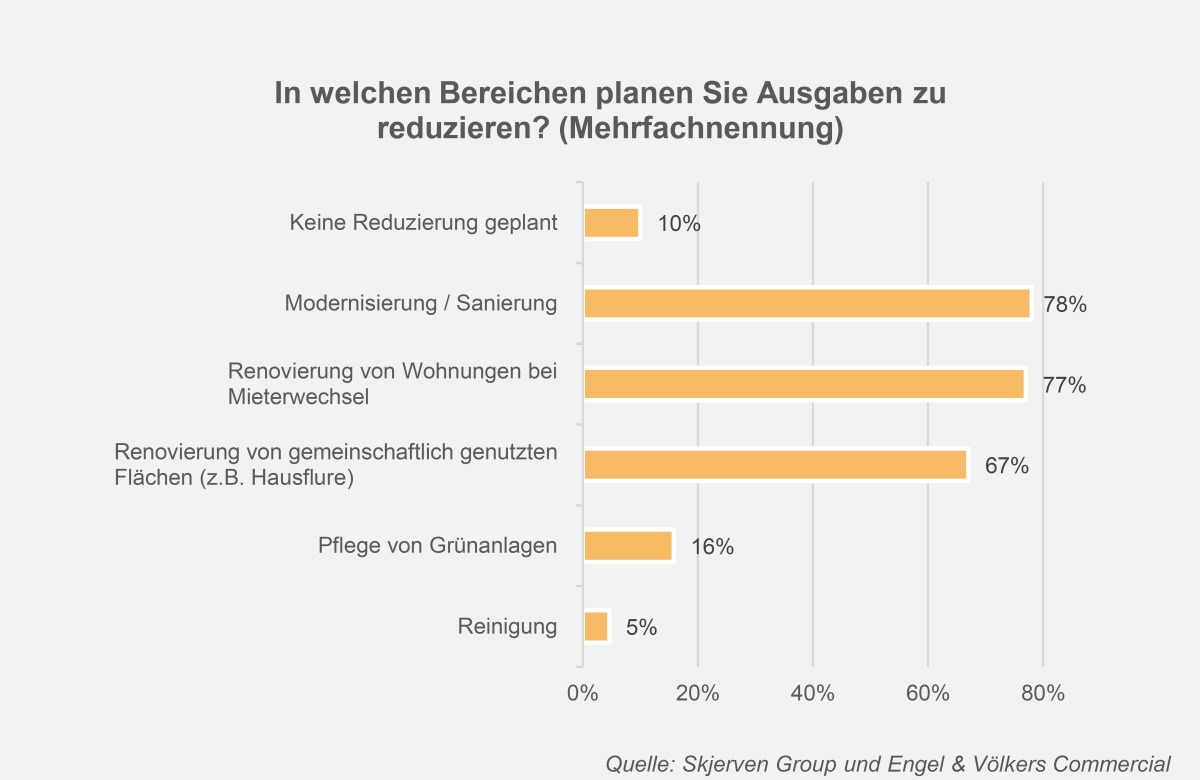 Dem entspricht, dass fast 78 Prozent der Vermieter bei Modernisierung und Sanierung sparen wollen. Zwei Drittel der Befragten sehen Einsparpotenziale vor allem bei den Gemeinschaftsflächen. 77 Prozent erklären, demnächst auf Renovierungen bei Mieterwechsel verzichten zu wollen.